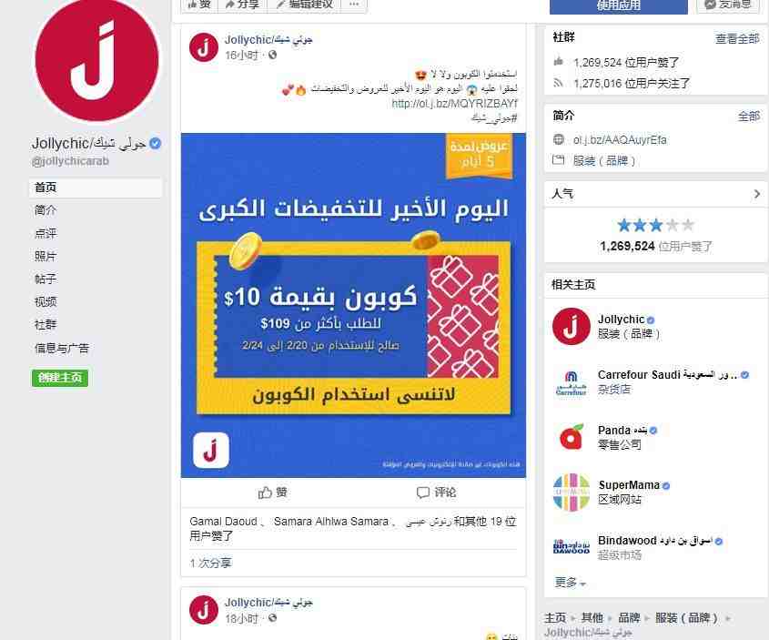 比如,执御旗下的品牌Jollychic在twitter、Facebook和Instagram都拥有自己的社交账号。其中,有的社交账号是专门为中东地区设置的。