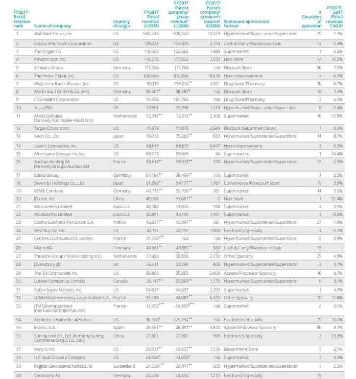 报告显示,沃尔玛位居第一,亚马逊继续上升至第四位。中国名次最高的是京东,升至第20位。