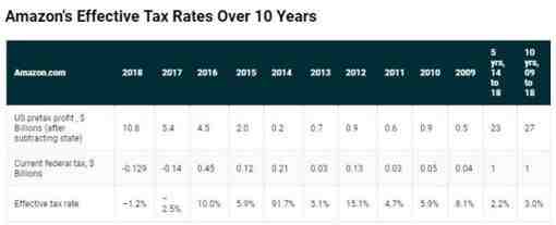 比如说,亚马逊去年净利润为112亿美元,但在享受了美国联邦税收抵免(tax credit)和扣除股权补偿后,还是获得了1.29亿美元的联邦退税,这个退税在抵消了21%的企业税率后,为亚马逊带来负1%的税率。