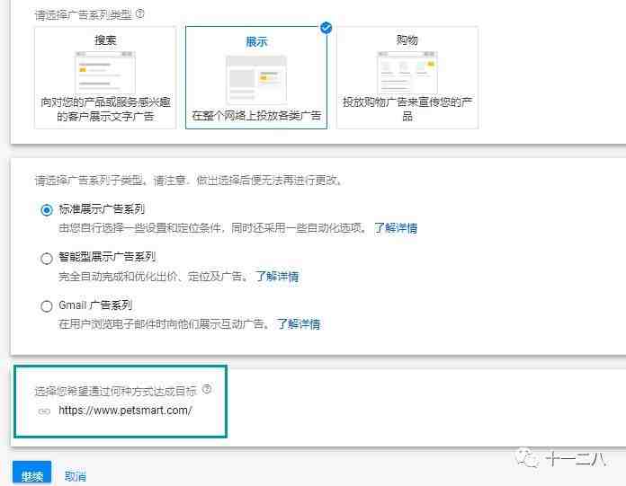 由于我没有权限,所以我这边选择了【展示】,一般选择【标准展示广告系列】,输入网站链接【https://www.petsmart.com/】,点击【继续】。