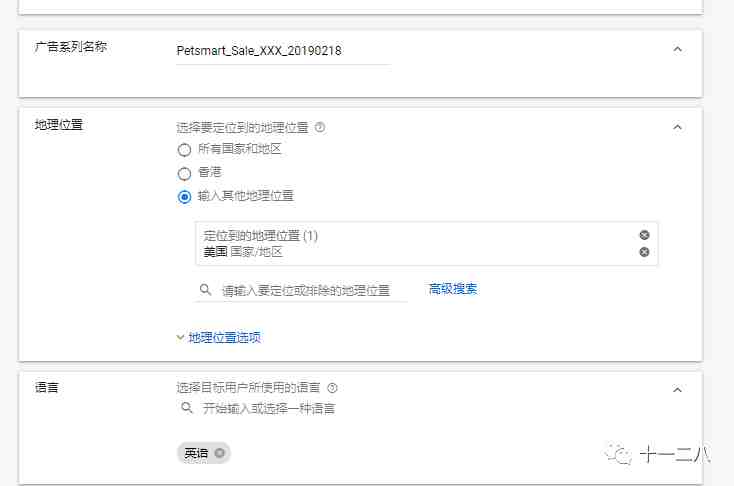 【地理位置】选择要投放的国家(或者地区),这里选择【美国】,语言【英语】,一般Google会智能推荐相应语言。