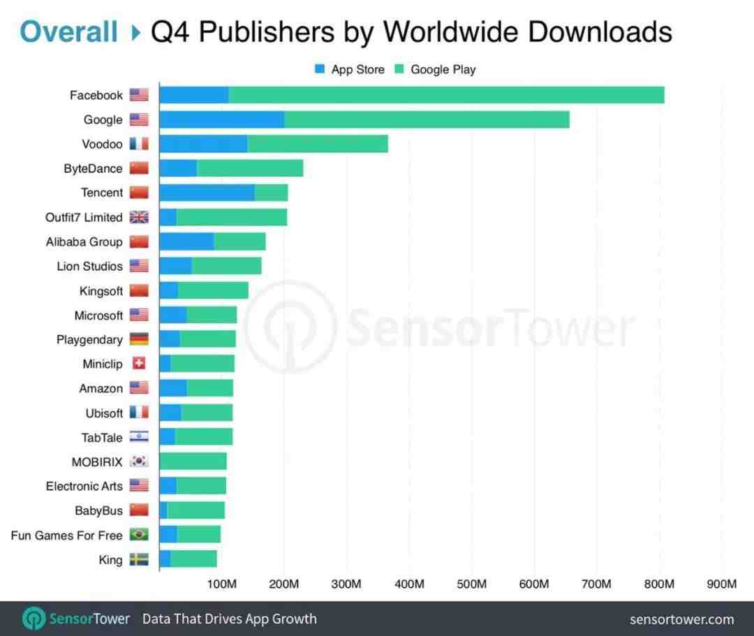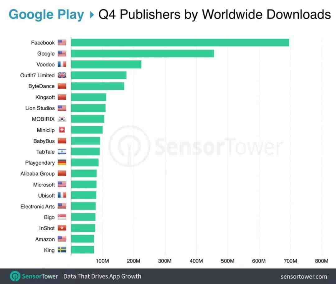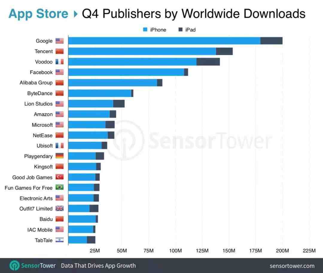 在 2018 年第四季度,全球下载量最高的 App Store 发行商是谷歌,其发行的应用程序在 App Store 上安装量接近 2 亿,其次是腾讯、Voodoo、Facebook 和阿里巴巴集团。