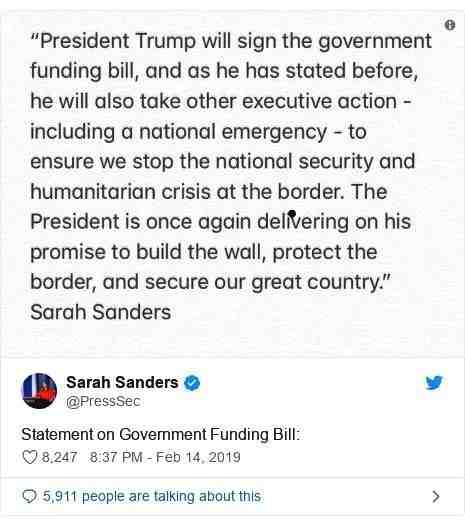 特朗普表示,他将签署有关国家紧急状态的最后文件。随后,白宫发言人萨拉·桑德斯在其推特中证实,特朗普已经签署了有关美国进入国家紧急状态的命令。
