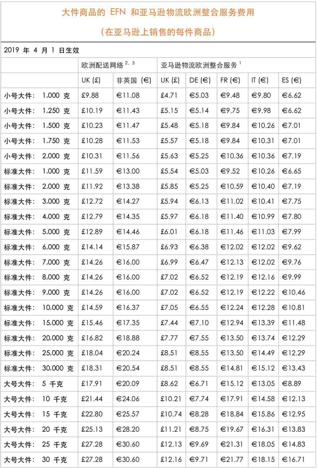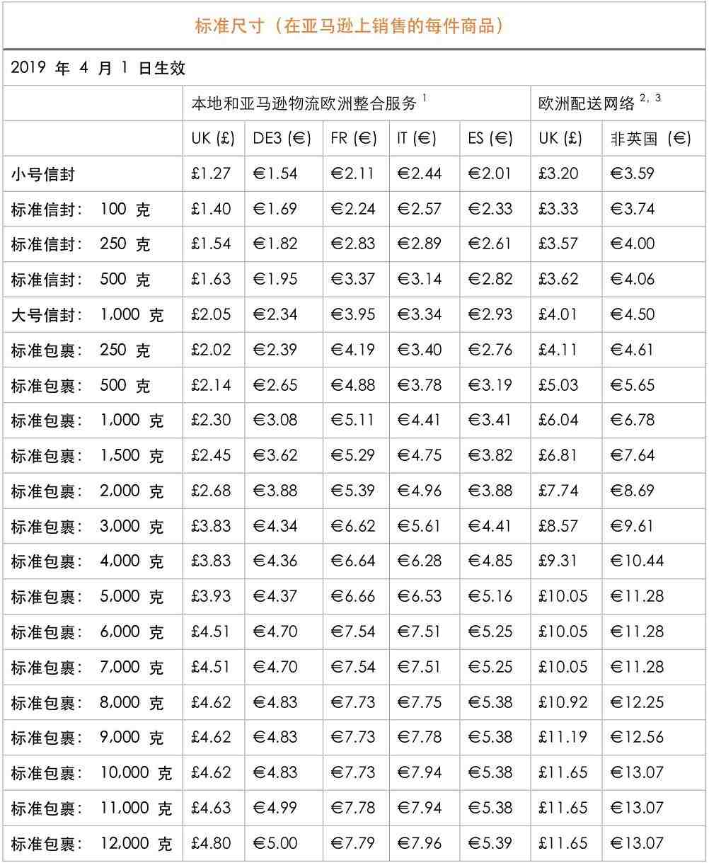 2019 年,为应对不断变化的配送、仓储、运输和客户服务成本,亚马逊物流 (FBA)将对英国、德国、法国、意大利和西班牙的费用进行调整。