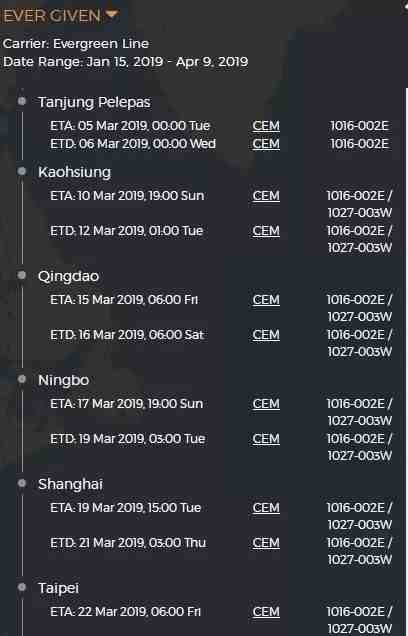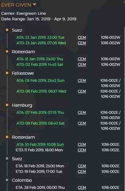 据了解,作为目前全球最大的集装箱船之一的 Ever Given 轮,目前服务于海洋联盟的欧洲航线CEM,分别有挂靠青岛、宁波、上海、台北、深圳等多个中国重要港口,同时船上共舱的船公司还包含中远海运,达飞轮船,东方海外及APL等多家船公司。