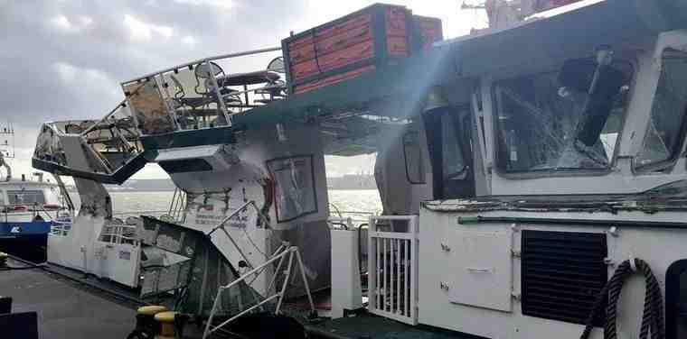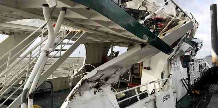 事发小渡轮被撞扁,窗门玻璃碎裂,铰链弯曲,消防队员还发现水线上方有一个裂缝。而“EVER GIVEN”轮只有油漆损坏。