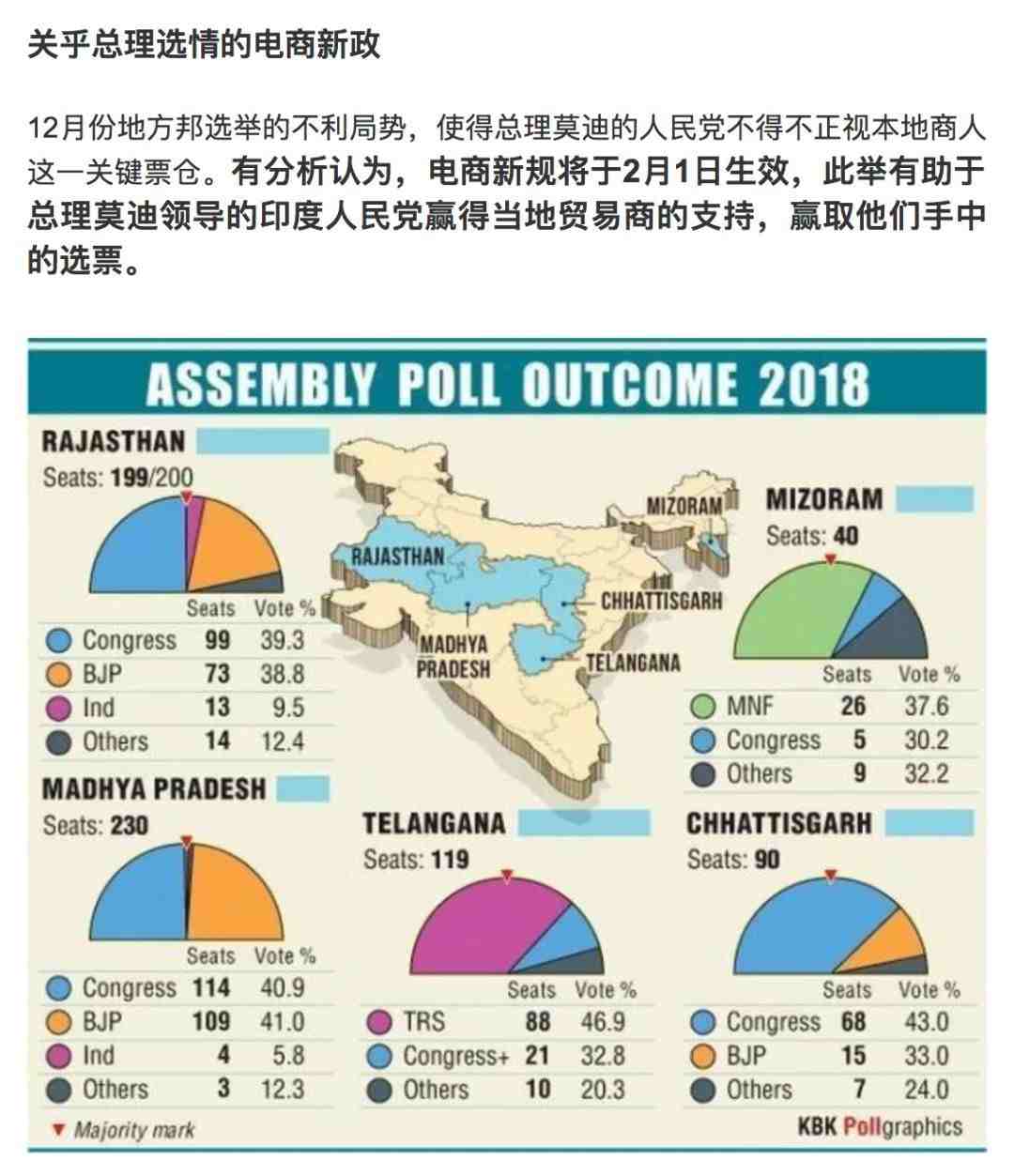 不管是摩根大通,还是RBC的提问, 都直指关键性问题,印度政府今天生效的新的电商法规,将极大程度地限制亚马逊印度和沃尔玛控股的印度Flipkart的发展,这个关系到了莫迪政府的票仓问题,莫迪不会为了两个外国公司的利益而放弃自己的党派利益。毕竟莫迪政府在前期的州选举上已经失败得很彻底,看看下图就知道了,BJP就是莫迪所在的政党,而国大党Congress现在领先很多啊!所以莫迪必须要在大选上挽回。