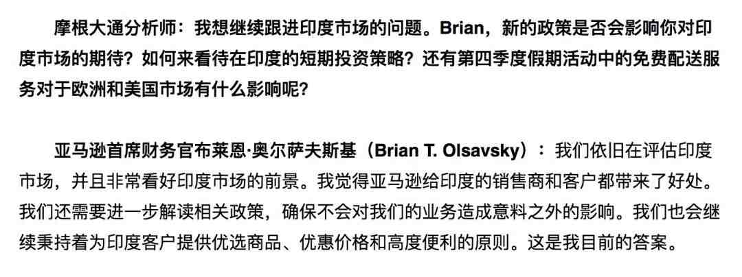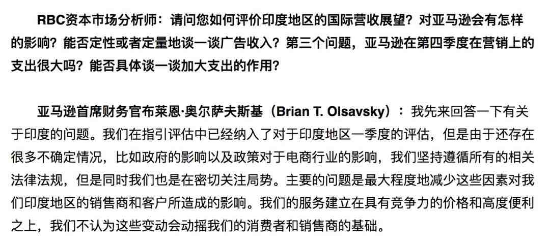 2019年,本来亚马逊是雄心勃勃准备追求更高的增长,把希望寄托在北美市场、印度市场、云服务和Alexa。但是中美贸易战以及美国优先的政策,似的世界经济形势动荡不安,第四季度的增幅大大低于预期,2019年的形势更加微妙;云服务和Alexa确实是取得了长足的发展。但是印度市场到底如何呢?其实国际媒体也比较关注这个问题,亚马逊的CFO是如下这么回答的,Mark的整体感觉是答非所问。