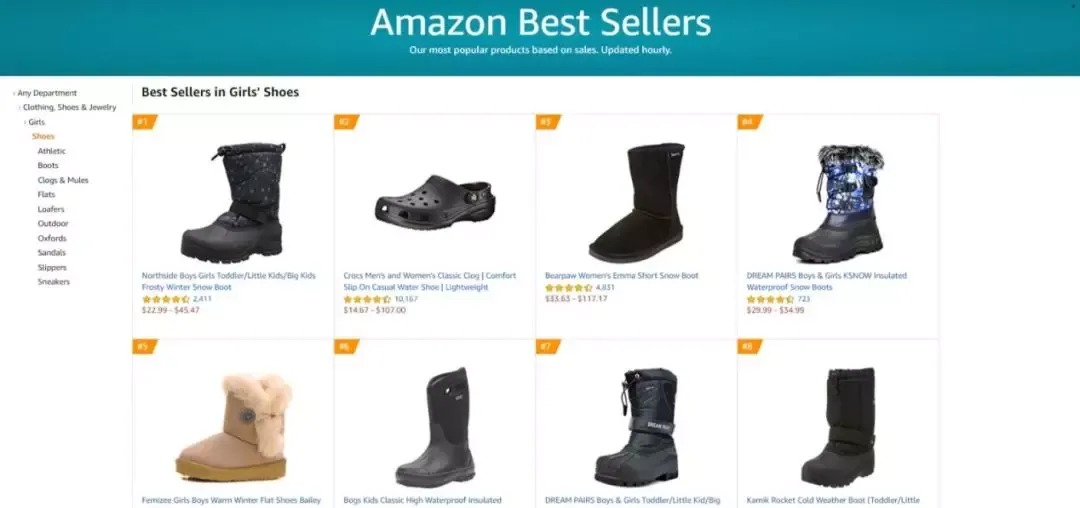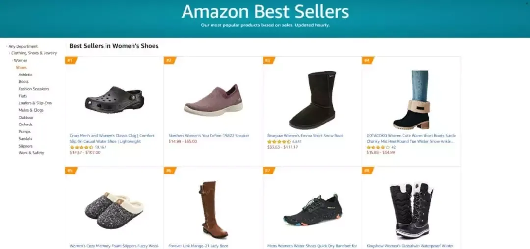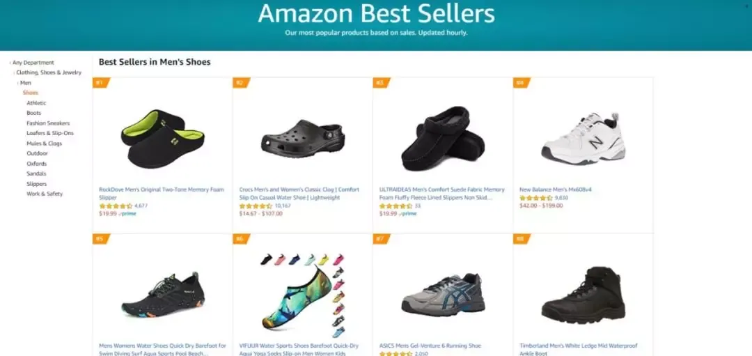 为了让你的鞋子卖得更好,你必须销售买家想买的鞋子,而且你不能就随便挑选一双鞋子放亚马逊卖,然后就翘着脚等订单自己进来。你必须战略性地转售鞋子。首先,卖家需要查看亚马逊畅销产品页面,查看最畅销的鞋子。本文撰写之时,畅销鞋子清单如下:
