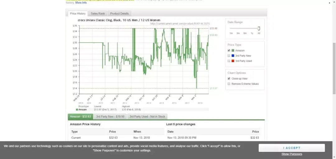 以Crocs的洞洞鞋为例。CamelCamelCamel展示了Crocs定价自2008年在亚马逊上首次刊登以来的变化情况。最低价格的洞洞鞋售价为13.95美元,而最高价为35美元。当价格下跌或上涨时,都会有图表提醒你。