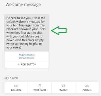在消息框中设定默认的欢迎页消息;这是用户进入您的Messenger时最先看到的内容。您可以保留此消息框,或者使用其他的消息类型。