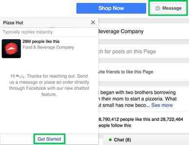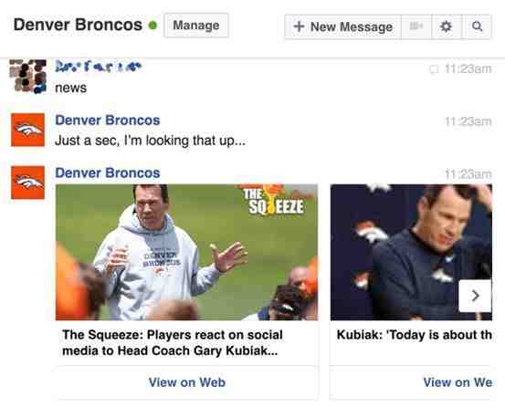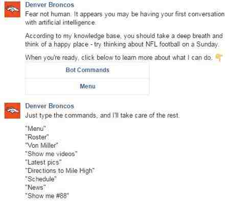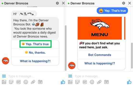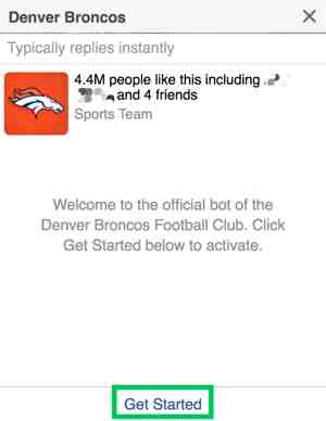 Denver Broncos的Facebook主页结合了基本菜单机器人和人工智能的特点。当您单击页面上的消息按钮时,将会打开Facebook Messenger窗口,然后在窗口上单击"Get Started"。