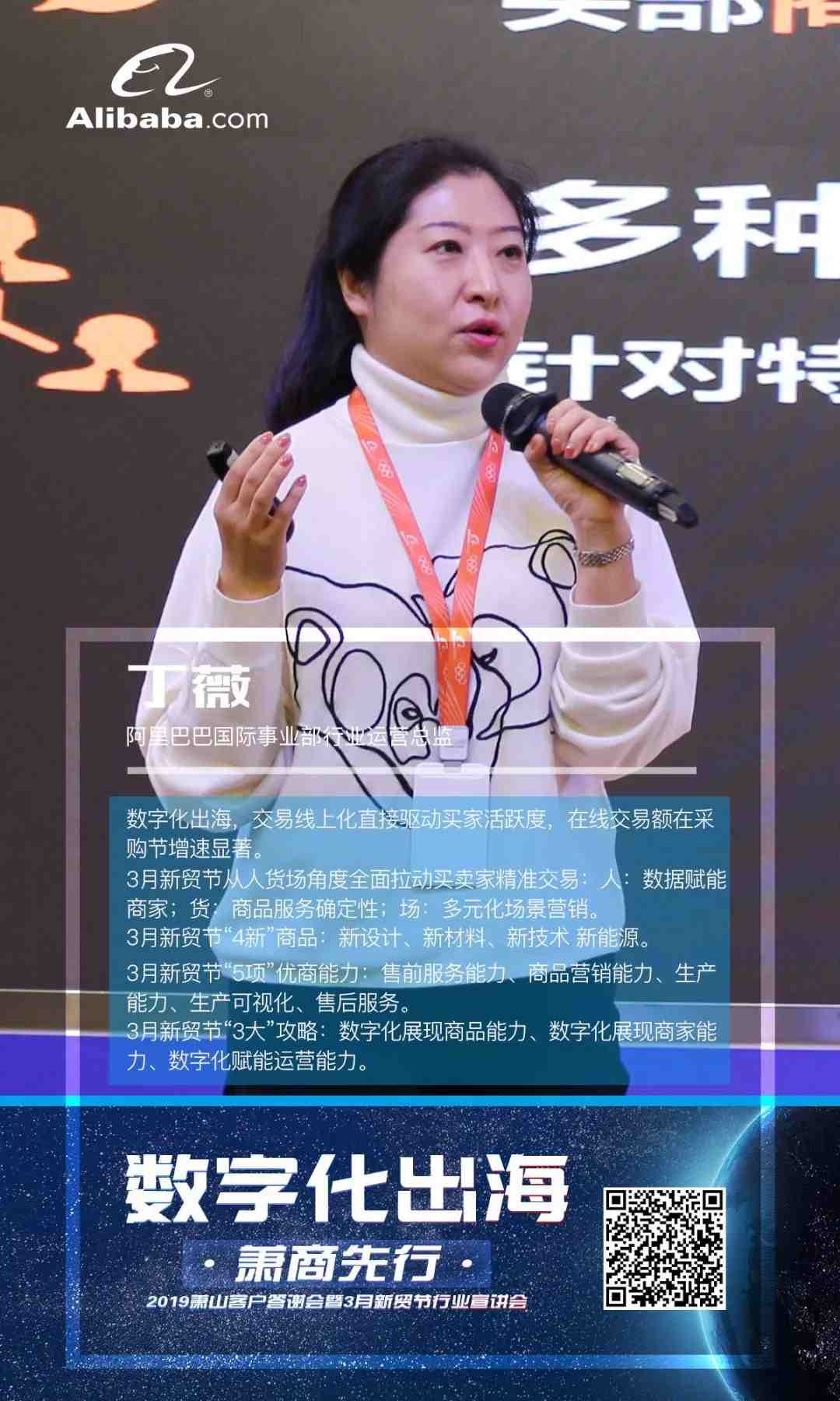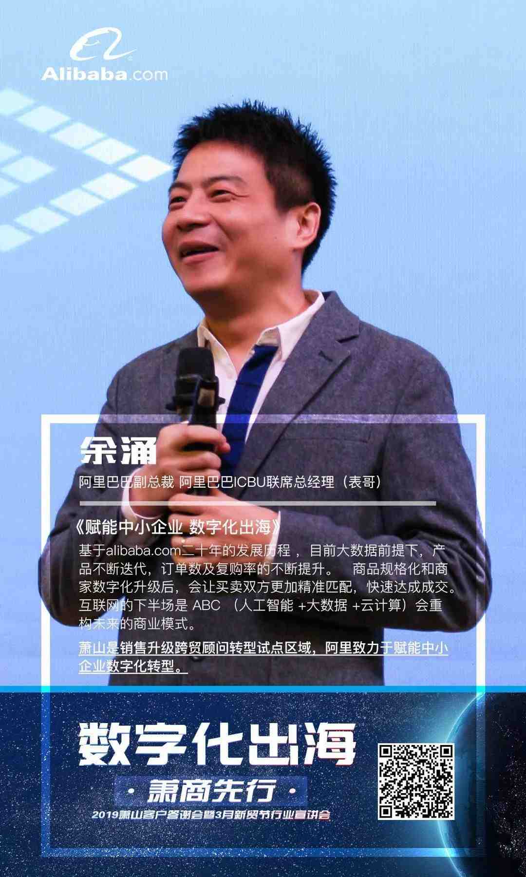 基于alibaba.com二十年的发展历程 ,目前大数据前提下,产品不断迭代,订单数及复购率的不断提升。商品规格化和商家数字化升级后,会让买卖双方更加精准匹配,快速达成成交。互联网的下半场是 ABC (人工智能 +大数据 +云计算)会重构未来的商业模式。萧山是客户顾问转型试点区域,阿里致力于赋能中小企业数字化转型。