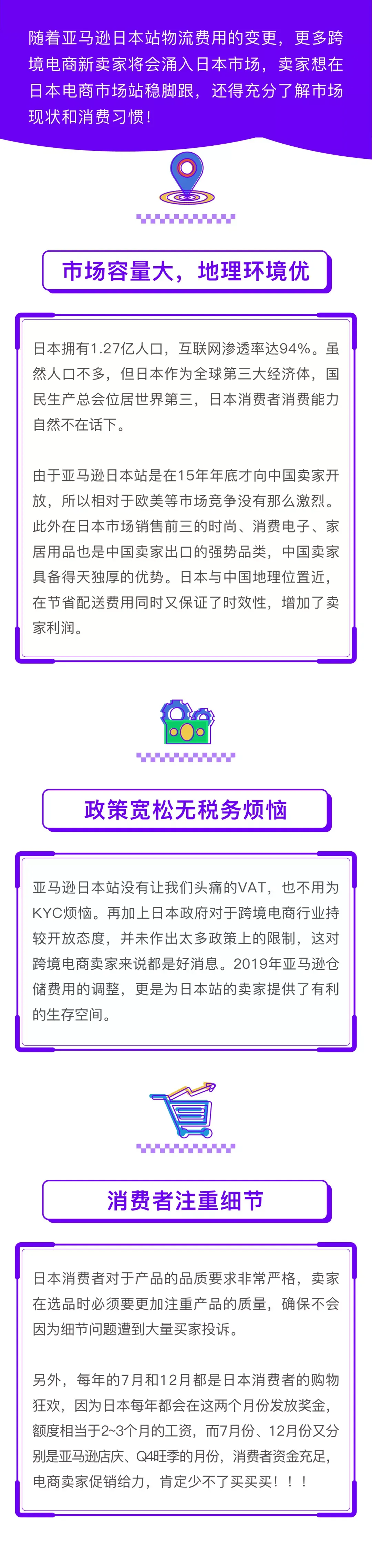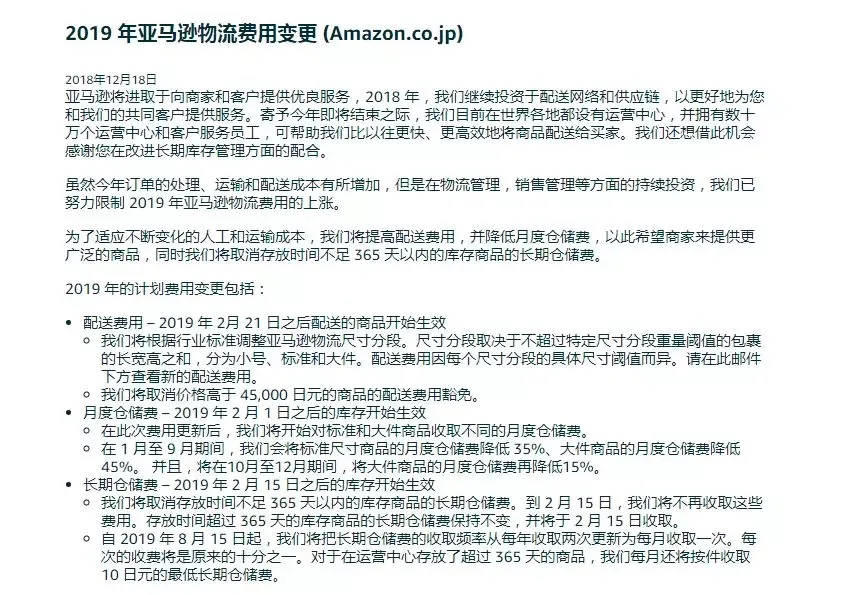 中美贸易战、全球税改、平台政策变动及行业竞争日益激烈,甚至有卖家说跨境电商行业已经进入“寒冬”。但就在这样的背景下,亚马逊日本站首先传来好消息:为适应不断变化的人工和运输成本,亚马逊日本站将降低仓储费,提高配送费用。 图片来源于跨境知道 从物流费用变更细则来看,标准尺寸商品和大件商品的月度仓储费降幅达到35%-45%,对于日本站卖家来说还是相当给力的,长期仓储费也以年作为划分,收取频率由原来每年两次变更为每月一次,每次收费将是原先的十分之一。 *部分信息、图片来源于网络