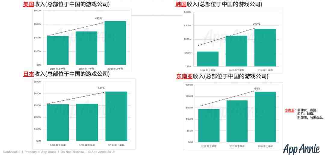 但与此对应的是,中国发行商 18 年上半年在美国的收入相比于 17 年上半年增长了 52%,在日本的收入增长了 34%,整个东南亚在 17 年上半年到 18 年上半年期间,营收也增长了 52%,出海到韩国的分成后收入总盘增长到了 3 亿美元,增长率达到了 153%。所以说,虽然美国、日本和韩国是所谓的“存量市场”,但中国发行商在这里取得了巨大的成功。