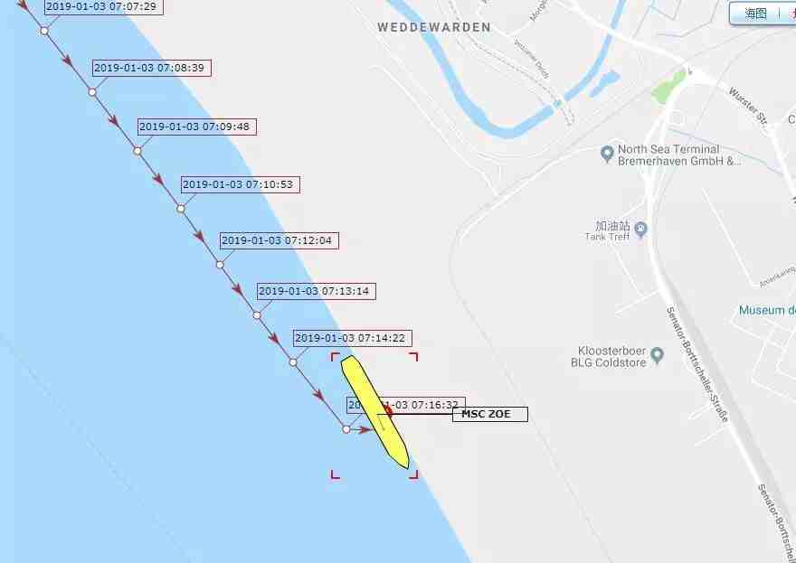 “MSC Zoe”号集装箱船最新航行轨迹,如图所示。