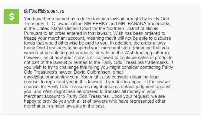 一位卖家收到了平台发来的邮件,被告知账户资金被罚了5000多美金,他已经被SIR PERKY和MR BANANA商标的所有者起诉。该卖家称自己仅售出4件相关产品。然而,另一位卖家仅售出一件产品(这仅有的一件,还可能是被流氓律所下的取证单),同样被罚了5000美金。