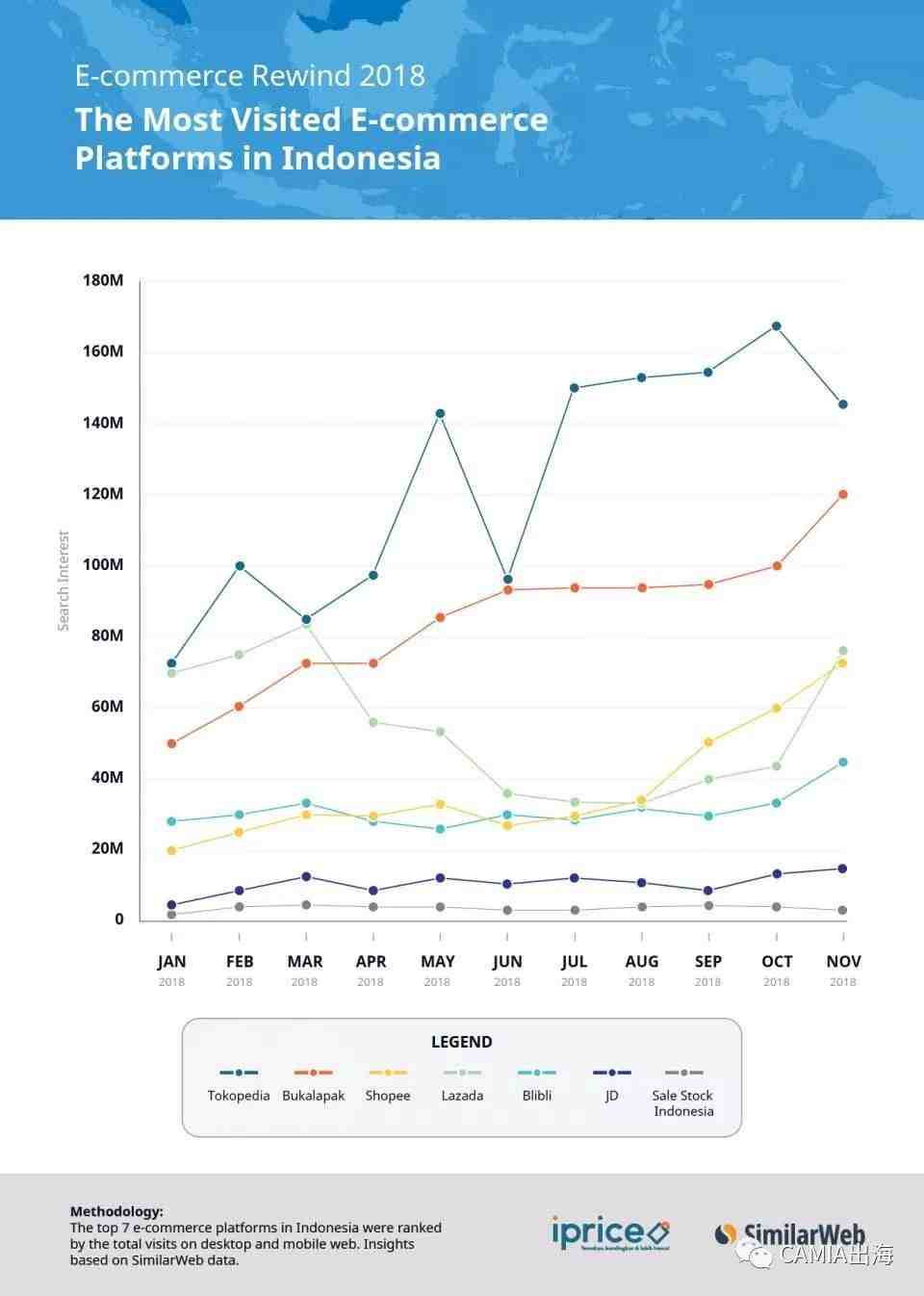 到2018年11月份,各大电商流量逐渐上升。其中增长最快的为JD,增长率高达246%。其次为Shopee,增长率高达158%,Tokopedia94%。