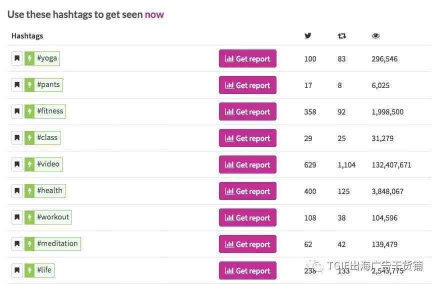 . 工具: 我觉得最高效的方法是,依靠工具帮我们分析。市场上有很多 Hashtag 分析工具(有免费的),只要你输入你的产品,它就可以建议那些高热度的 Hashtag。