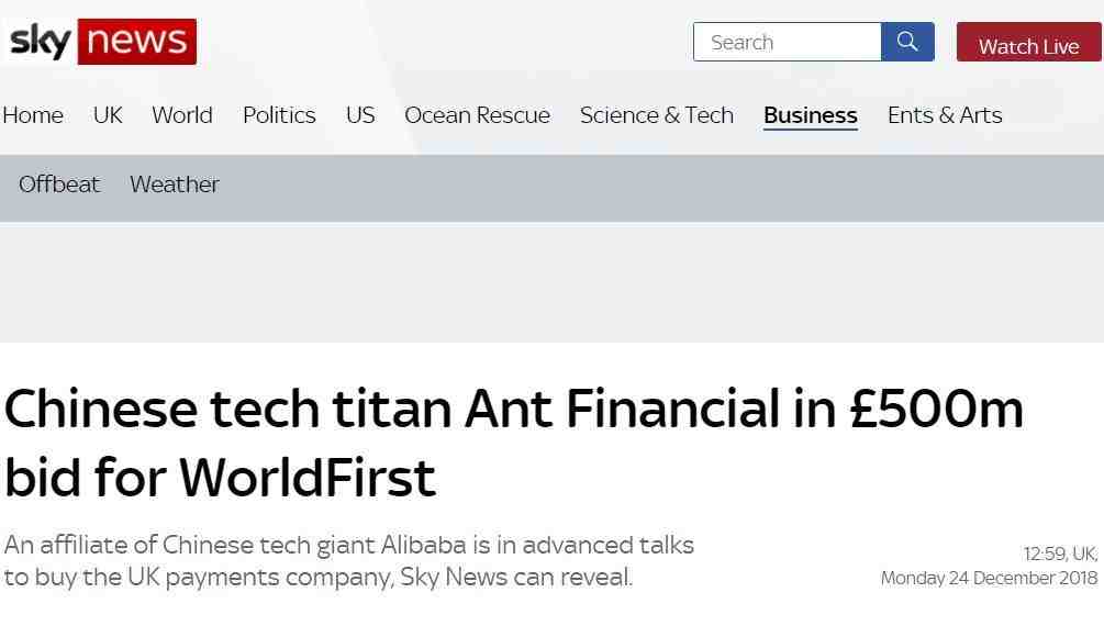 据Sky News报道,中国最大互联网公司阿里巴巴旗下的子公司蚂蚁金服(Ant Financial)拟以7亿美元(约合5.5亿英镑)收购总部位于英国的金融科技公司WorldFirst。
