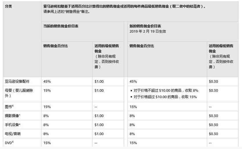 对于总销售价格不超过$15的商品,亚马逊会将食品类商品的销售佣金百分比从15% 降至8%。对于总销售价格高于$15的商品,亚马逊将继续收取15%的费用。对于30个分类,亚马逊将把每件商品的最低费用从$1降至$0.30;而对于珠宝首饰和钟表分类,每件商品的最低费用将从$2降至$0.30。