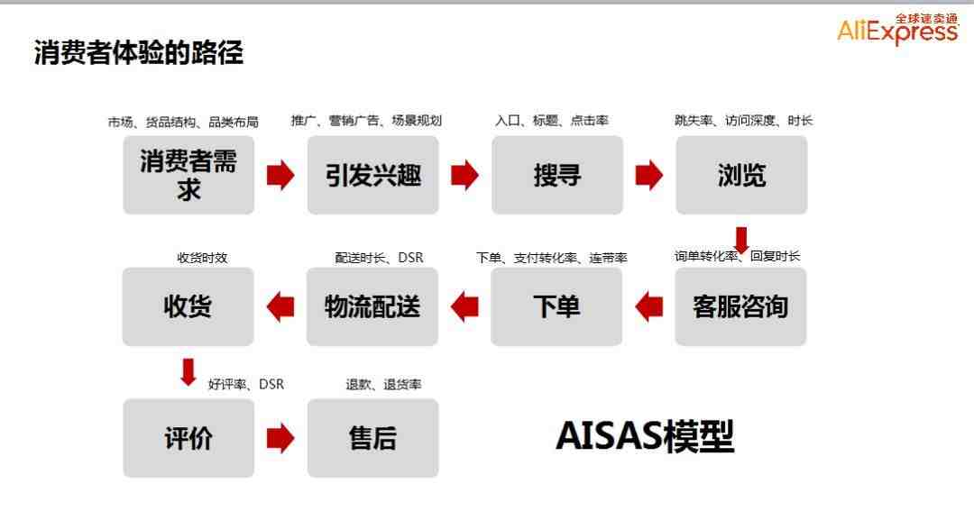 先来看一下,这是一个大家都知道的,但是很多人不愿意看这样的东西。这是一个消费者体验的路径,不管哪个国家的消费者,进来之后基本上是这样的链路,首先他得有需求,这个需求在于显性需求和隐性需求,显性需求就是非常清楚自己要买什么,隐性需求就是我今天看一下,你被哪个推荐吸引过去了,所以的话这里面决策出来我们要做更多事情,无论你未来要做粉丝运营,内容的运营,这是为了勾引人家隐性需求,显性从后面来做,然后引发兴趣,这个可能是图片,标题,再往后面他要搜寻,注意不是搜索,搜索很容易跑到搜索方搜索,搜寻受到找到自己购买渠道。他也有可能通过某个活动入口进去的,也可以通过搜索进去的,也有可能通过其他的找自己的以前买过店铺进去了,因为不同搜索入口对他定位不一样的。然后再往下就要开始浏览,他浏览什么东西,看什么东西。再往后就是要浏览,也有通过咨询这个东西,咨询有两种,第一种人和人之间咨询,还有一种他是跟你神交。也就是说你要知道他可能会问什么,你要通过详情页,通过文案把他可能要问到的问题提前告诉他,这是一个。再一个就是下单,他到底买一单还是跑了,还是买了一单,再到店铺看一下再下一单。不同的下单路径你们要做的事情不一样的,对不对?再往下就是物流配送,再往下收货,然后评价,售后。这是一个正常的用户会走的路径,大部分商家思考运营的时候,他不会考虑他的用户在体验什么样路径或者他碰到问题的时候,他才会想到我的用户原来在这个时候会在意这个东西。而不是说整个经营链路,从你们家店铺定位开始整条链路围绕用户的这个体验来设计的如果你是围绕这样的体验链路设置的,你现在店铺不行,过一两个月肯定行。从需求端开始,你要了解市场,了解货品结构,了解竞争,你要布局你的品类。我到底卖什么。