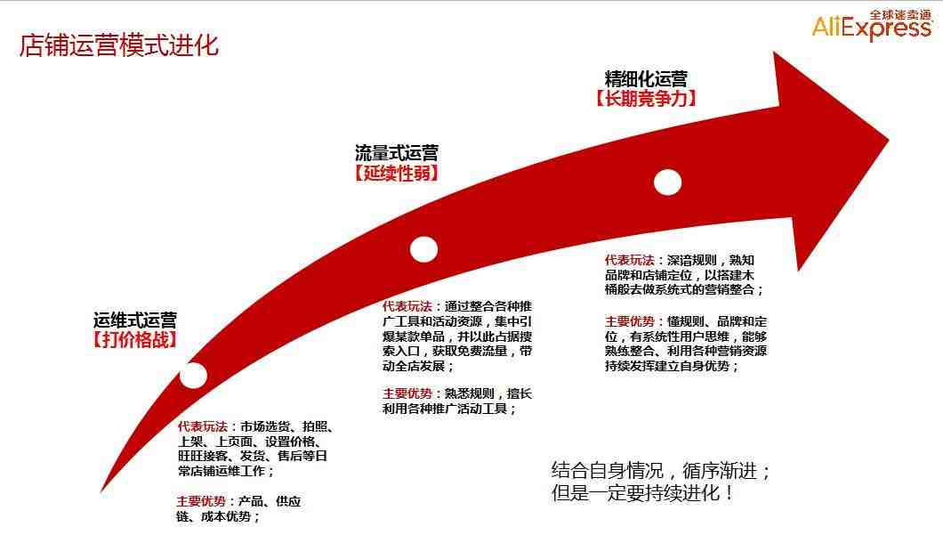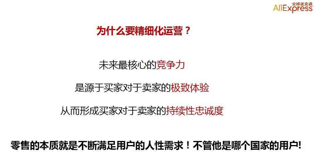 第二个精细化运营是为了让你品牌优势,供应链优势,商品优势有更高小的变现。为什么?很多人觉得我们家有钱,我们家有商品,我们家有工厂,我们家什么都有。但是你要知道当你没有合适的运营团队,通过运营手段,帮你激发这些优势的时候,你发现你没有办法变现,这是为什么国内很多大品牌跑到速卖通,结果没有做好。为什么?他就这么一个人负责,还不是专业做速卖通的,你说品牌优势强不强,资金链强不强,都强,就是做不好,原因就在这里。