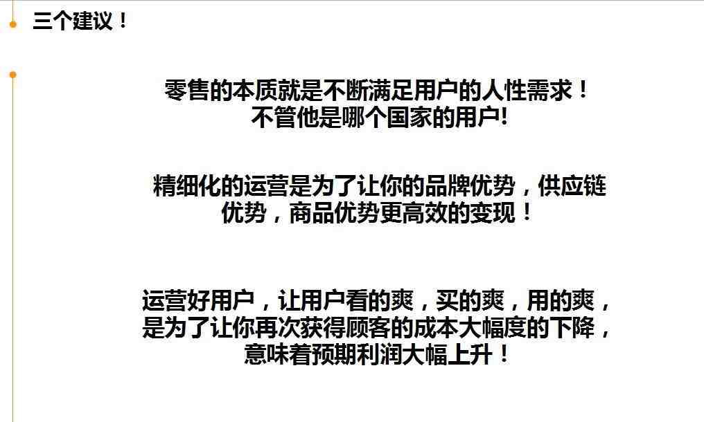 最后给大家三句话建议,第一句话零售本质就是不断满足用户的人性需求。不管他是在哪个国家的用户,这是一个,我希望大家思维上能有这样的概念。当然你可以不认同,你也可以认同,所以我们做的所有事情都是围绕人性设计的。对吧?大家做的所有运营动作都是为了满足人性的。