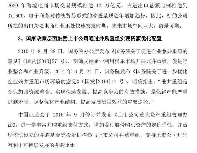 元,预计至 2018 年将达到 9.0 万亿元。2011 年至 2017 年,跨境电商交易规模占我国进出口贸易总额比例逐年增长,2017 年占比为 27.35%,阿里研究院预计2020 年跨境电商市场交易规模将达 12 万亿元,占进出口总额比例将达到37.6%电子商务对传统贸易形式的渗透呈现逐年增加趋势。因此,标的公司所在的出口跨境电商行业正处快速发展时期,未来市场空间巨大,前景可期。