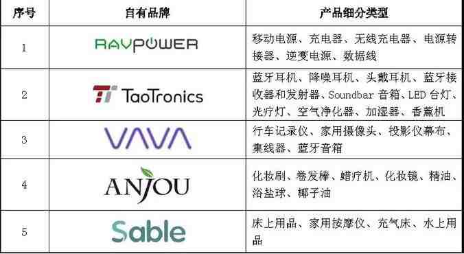 拥有RAVPower、TaoTronics、VAVA、Anjou、Sable五大主要自有品牌,主要产品类型包括电源类、蓝牙音频类、小家电类、电脑手机周边类、个护健康类、家纺家居类等,具体情况如下: