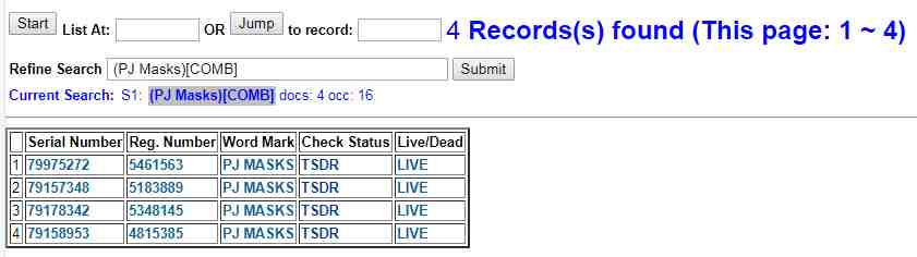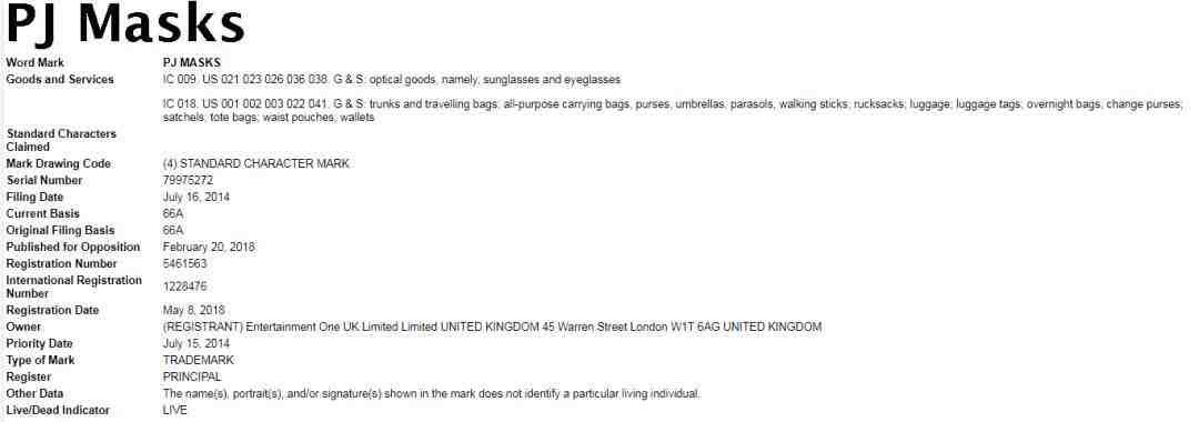 经小编手动查询PJ Masks注册商标有4个,商标所有者为One UK。