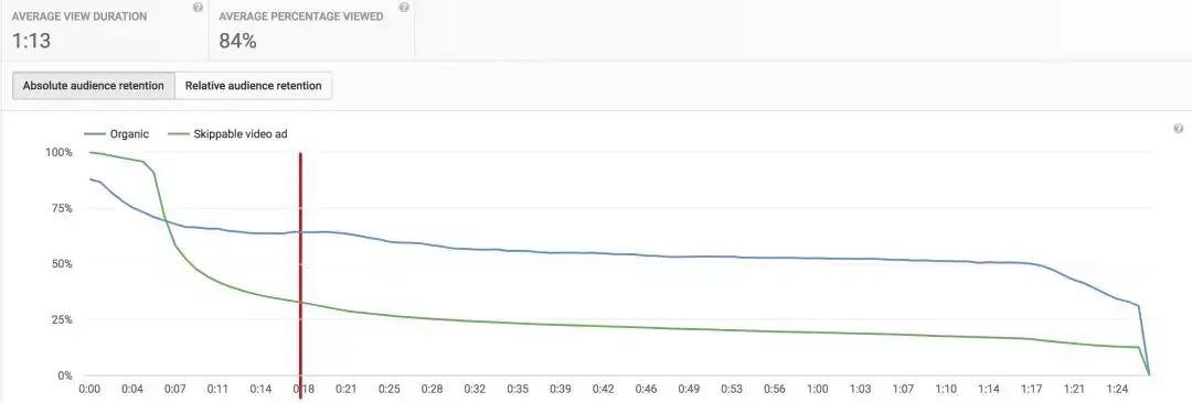 如上图所示,平均观看时长是 1 分 13 秒,约占整个视频的 84%,可能你会觉得这样的数据很不错,但是按照 YouTube 的标准,这个视频只能称得上是一个短视频,在更长的视频中,你还能看见数据有更明显的下滑趋势。