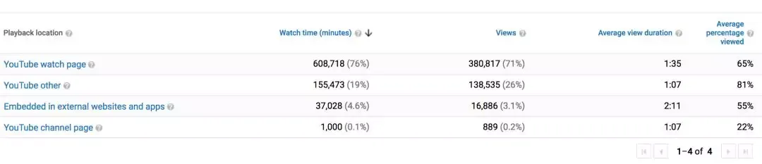通过 YouTube 算法控制面板你可以发现,在播放位置页面、每个视频播放位置的总播放次数,其中播放位置分别为 YouTube 频道页面、YouTube 观看页面、嵌入外部网站或 app。