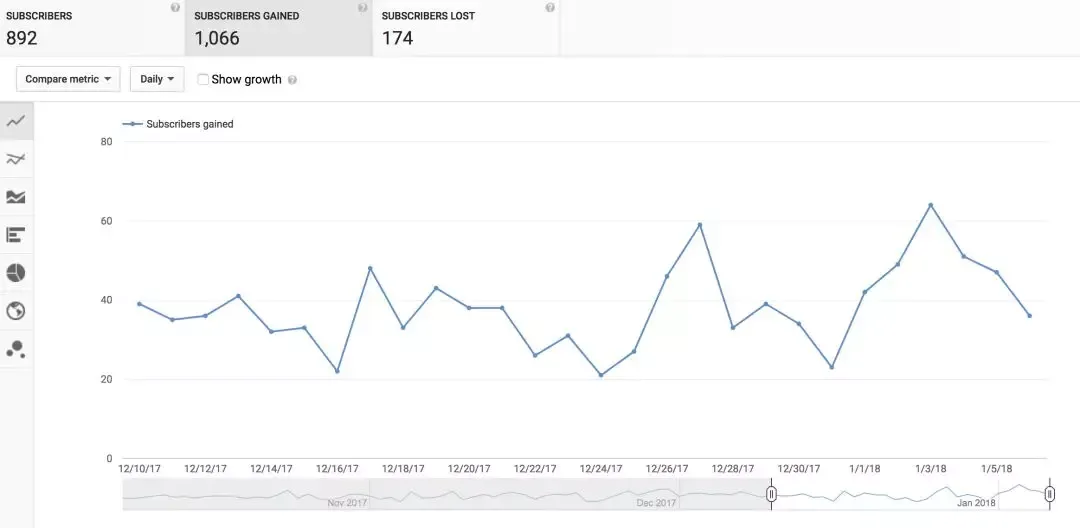 因此,监测订阅基数的波动也是非常重要的,通过监测该波动,可以从宏观角度观测你的 YouTube 频道,了解每个视频对获得流失订阅的影响。