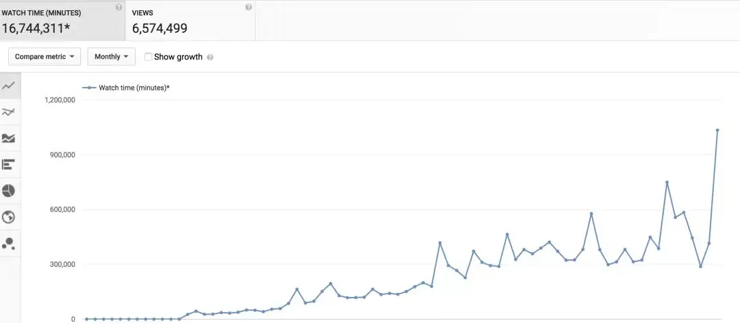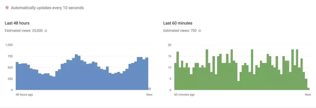 YouTube 在计算观看次数时,会把无用的观看次数和低质量的观看次数从观看总数中移除。在视频发布初期,需要密切关注频道的实时报告,并了解频道或特定某一视频在过去 48 小时(近两天)和过去 60 分钟(近一小时)的预估观看量。以此,来了解和分析视频营销效果、推广渠道等。如有人在 Reddit 或其他社交网络分享了你的视频,YouTube 算法控制面板中的数据则会呈现明显上升趋势。