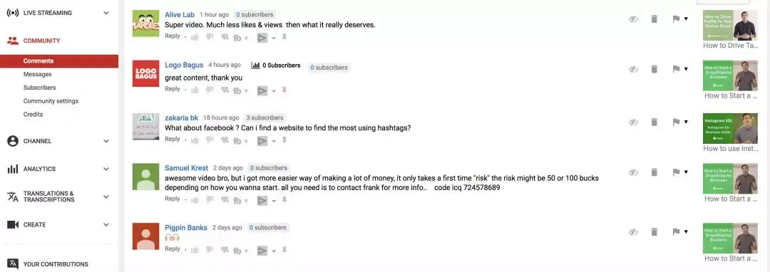 点击 YouTube 控制面板下数据分析的评论页面,就能看见评论的频率和日期,你还能看到每个视频的评论总数。进入评论板块,寻找机会与粉丝进行互动并获得高质量的反馈。