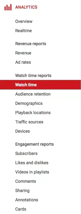 无可否认,观看次数应该是判定 YouTube 视频成功与否的一个重要指标。但单纯地分析观看次数,其实并不能提供更多信息来提高 YouTube 视频质量。因为,标题党骗点击的风气盛行,造成观看次数虚高。因此 YouTube 不会给观看次数太多权重,而是将“观看次数”完全从控制面板的侧边菜单中删除,取而代之的是“观看时长”。如下图所示,YouTube 将“观看时长”放在 Top 优先级: