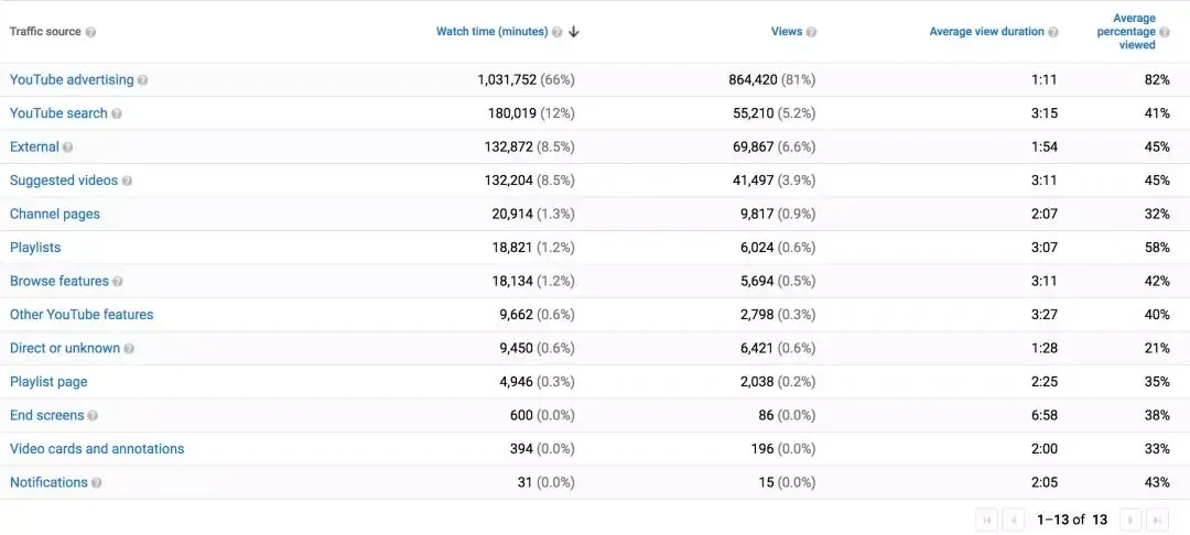 YouTube 算法控制面板可以确定,你的整个频道和你创建的每个视频的最优流量来源,不要只盯着他们带来的视频观看次数,要知道,不同渠道带来的流量质量也有所不同。