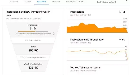 如果视频展示次数很高,但观看次数不多,你可能需要改进视频封面缩略图和视频标题,让它们对潜在粉丝更具吸引力。