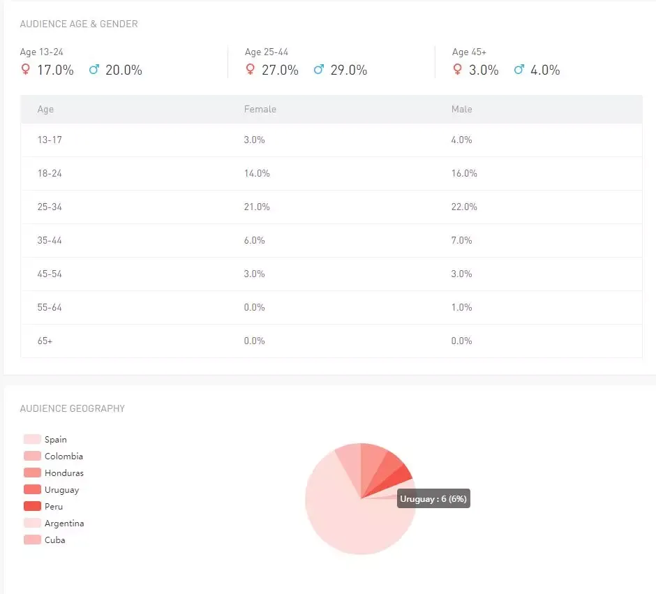 YouTube 受众分析,能够更精准的将定向广告内容触达潜在的目标用户。因此,当营销者们寻找网红合作时,尽量获取每个网红的档案数据,分析受众特征。如无法获取也可通过第三方 YouTube 分析工具NoxInfluencer,来查看网红详情页的受众特征。