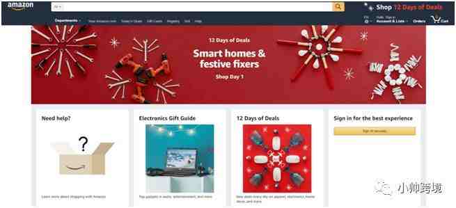 如下图,亚马逊已经开始利用圣诞红、雪花等元素给其网站增添节日气氛,给人以欢愉感。