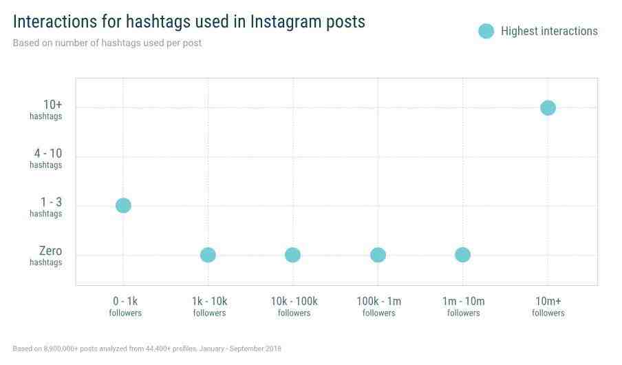 不仅如此,tag 方面也出现了相似的趋势。不到 1,000 万关注的账号不加 tag 就能得到更多的互动率,而超过 1,000 万关注的账号只有添加十个左右的 tag 才能带动更多的参与度。