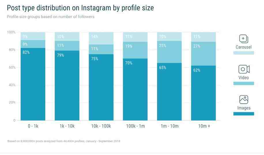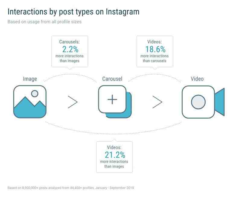 Quintly 的一份针对 Instagram 2018 年 1 月至 9 月账户的调查显示,Instagram 上的视频帖子的互动率可比其他内容类型高 21.1%。