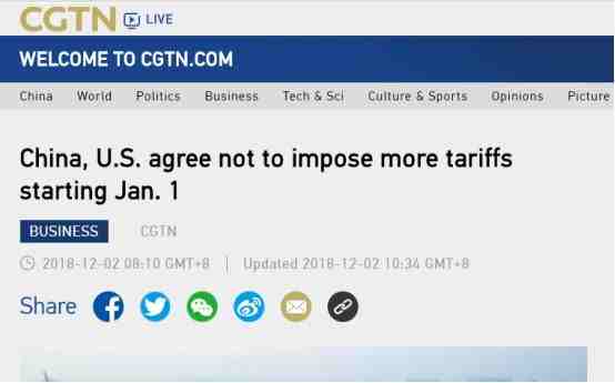 美国同意在2019年1月1日暂缓对2000亿美元中国商品的关税从10%提升至25%。中国同意从美国进口大量(数额待定)农产品、能源、工业及其他产品。农产品的进口立即进行。