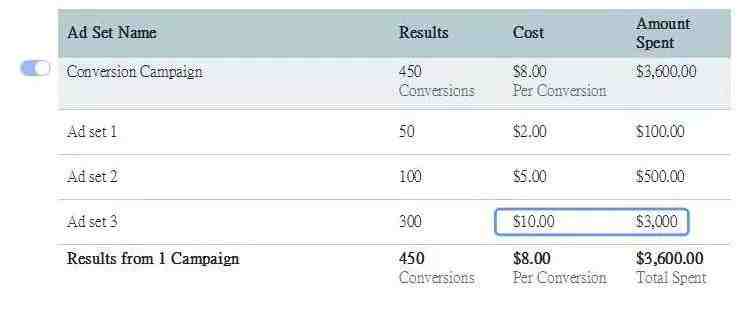 对 CBO 而言,有时获得大部分预算的广告组不会是平均每次转化费用最低的广告组。当我们最大程度地利用一个广告组的所有低成本结果,并且知道我们可以继续在另一个广告组中获得更低成本的结果时,就会发生这种情况。