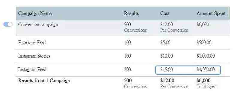 在广告管理系统报告中,广告主/运营者会查看广告组版位的汇总数据,并说 Instagram Feed 的表现不及 FB Feed 和 IG Stories,因为它的 CPC 较高。但是,这种细分会产生误导,如果我们删除 IG Feed,整个广告组的效率会降低。
