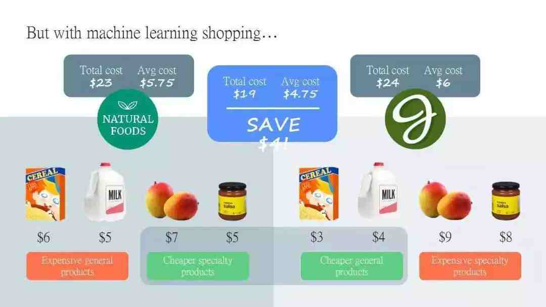 如果我们能够成为精明的购物者,并利用机器学习来找出最优惠的价格,我们就可以节省一些钱。该机器能够确定你在 Jaspers 市场上获得谷物和牛奶的最优惠价格,因为它是更普遍的市场,但芒果和沙拉在这里很贵,因为它们是更特殊的物品。在天然食品商店,有机牛奶和谷物的价格更高,但你可以在这里以优惠的价格购买芒果和沙拉。