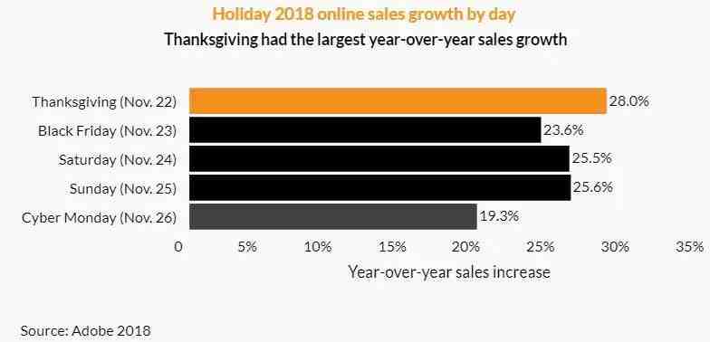 就增长率而言,网络星期一的增长是最少的,增长最多的要数感恩节,达28%↓