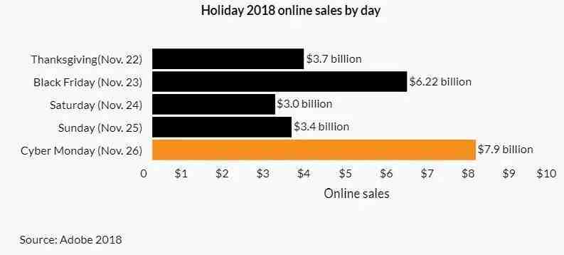 在11月1日至11月26日期间,美国购物者一共在线消费了超过585亿美元,比2017年同期的501亿美元相比,增长了16.8%。
