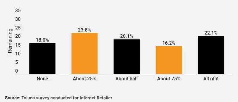 只有18%的受访者表示,旺季购物已经结束了,23.8%的受访者还留了25%,20.1%的消费者才购买了一半,16.2%的人还差75%没买,而22.1%的人几乎还没有开始假日旺季购物。